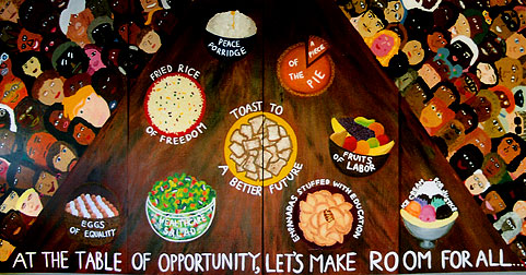 | Common Good Artist-Leaders: Hein Koh, Sharnae Mask, Carla Morales, Kimberly Niemela Images (clockwise from top): At the Table, acrylic on wood, 16' x 8' (2007); Youth Speak Out community event led by COSACOSA Youth Council members; still image from The End of the Line "silent movie" PSA on healthy eating habits; still image from Natural Selection PSA on neighborhood drug-related violence. |