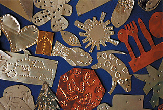 | Safe Harbor Artist-Leaders: Pedro Ospina with Dit Wah Deng Images (clockwise from top): Safe Harbor, wood and over 500 aluminum, brass and copper milagros, 20' x 8' (2001); workshop at Temple Children's Medical Center; milagros created by North Philadelphia community members; installation site overview. |