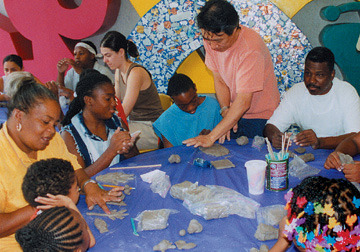 Families work together to create clay sculptures of "what connects us?" for COSACOSA's Connection project at Philadelphia International Airport with artist Dit Wah Deng.